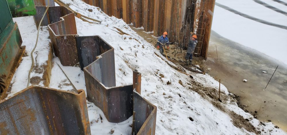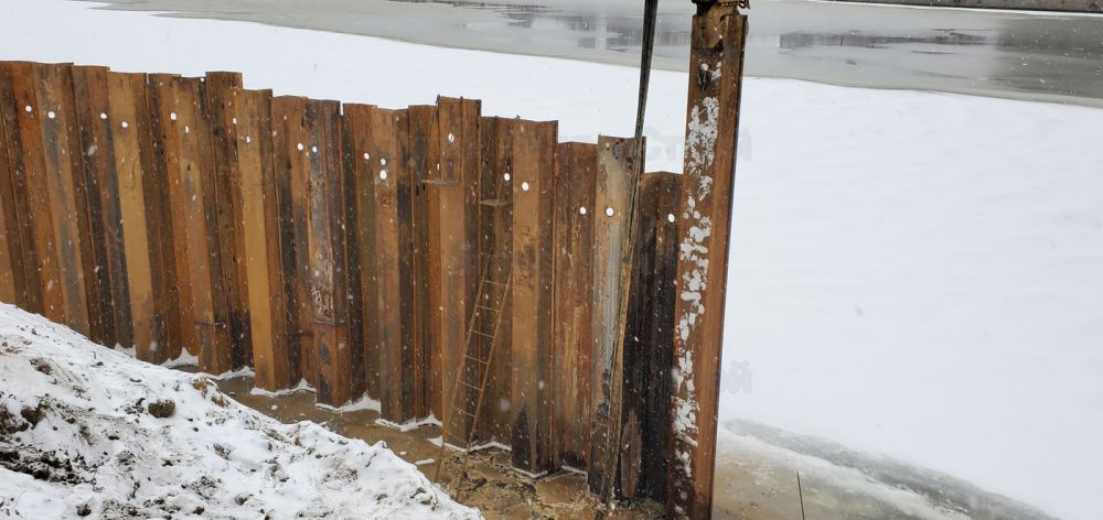 Шпунтовое ограждение котлована из шпунта Ларсена с распорами, выполненное специалистами «АрктикГидроСтрой»