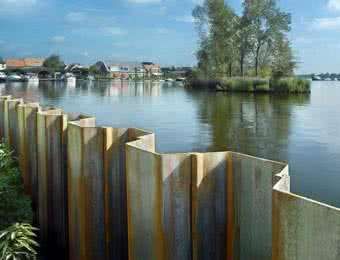 При работах на обводненной территории секции собирают на берегу и переносят на место работ стреловым краном. Соседние сваи разворачивают друг относительно друга на 180º и соединяют замками паз/гребень.