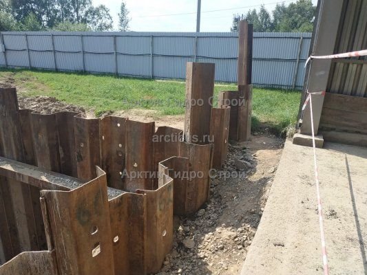 На сухих участках шпунты должны надежно крепиться в грунте. Если он песчаный или гравелистый, что затрудняет погружение, а участок расположен не ближе 20 метров к другим постройкам, технология позволяет использовать подмыв.