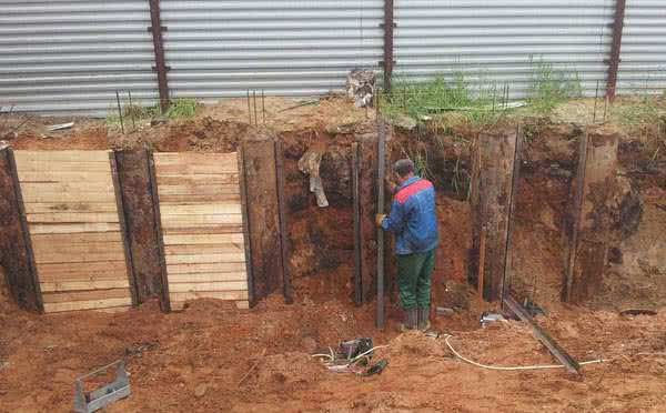 На плотном грунте, у которого устойчивости выше, а давление на стенку, соответственно ниже, шпунтовые сваи можно располагать не вплотную, а с интервалами. Промежутки перекрывают досками, стальными листами и др. Это и есть забирка для шпунта. Она позволяет сэкономить (понадобится меньше шпунтов). В дальнейшем забирка используется как опалубка при заливке фундамента.